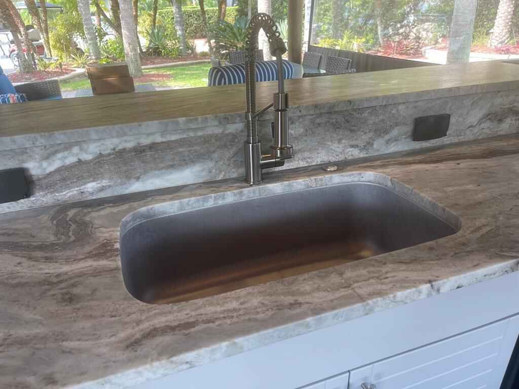 The kitchen sink has a garbage disposal. It is a Badger 1 garbage disposal which offers a heavy duty motor and space-saving compact design and Lift and Latch™ technology. The InSinkErator Badger® Series garbage disposals are a reliable and functional choice when affordability is the prime concern.